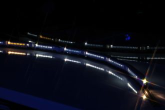 液晶パネルが普及していますが、その光拡散技術を応用したフラットリフレクター。光の拡散にムラが無く、LED一個の光源を車両全体に均一に行き渡らせることを実現しました。溝で拡散する方式やLEDを複数個使う方式では決して表現できない、優しく柔らかい間接光的な照明表現を可能にしています。また、長さは自由に設定できるため(任意の位置で切断できるため)、半室グリーン車の表現や、新幹線など車体長の長い車両の端までむら無く光を届ける事を可能にしています。